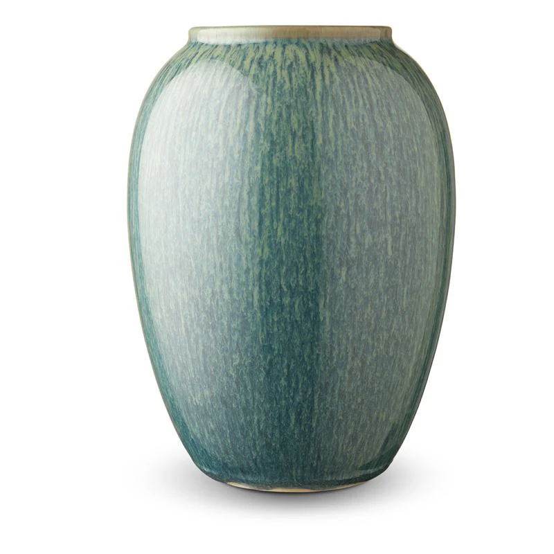 Bitz vasen på 20 cm er fremstillet i stentøj og glaseret med en reaktiv glasur der giver en helt fantastisk glød og farve. Den klassiske form gør at vasen står utroligt flot enten med en buket eller med vilde blomster- står også flot uden indhold. 20 cm høj – blank grøn farve på ydersiden.