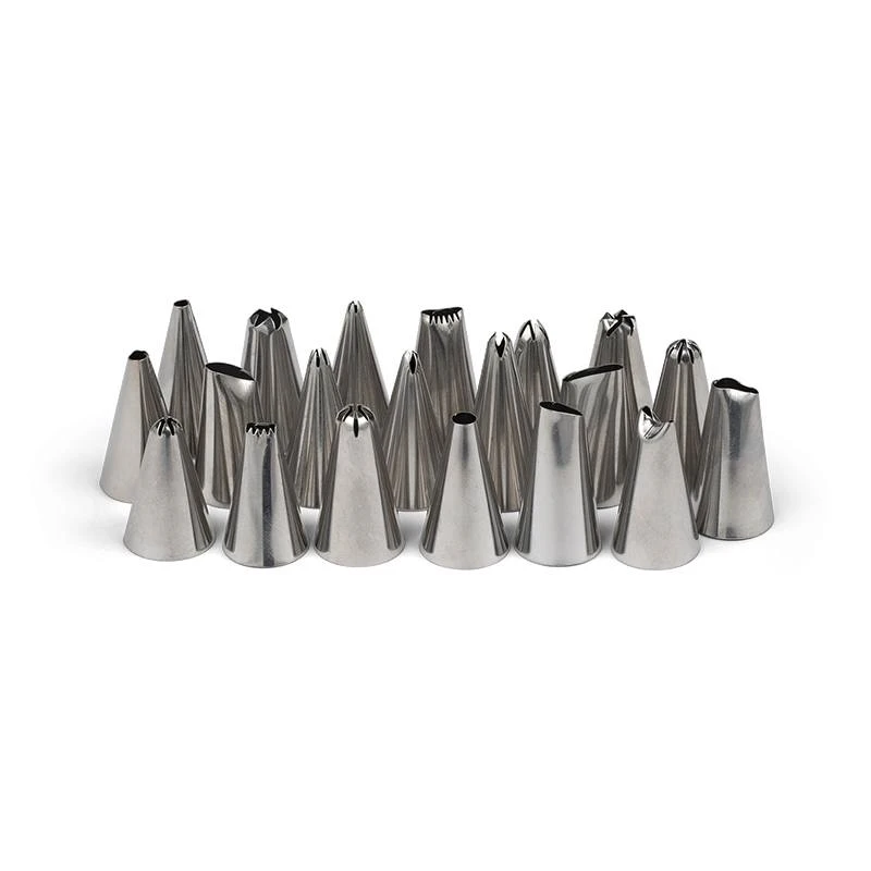 Sættet består af 20 forskellige 3-4 cm tyller og en Berlinertyl i rustfrit stål samt to tylkoblere og en rensebørste.