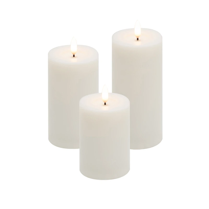 Perfekt pakke med bloklys i 3 forskellige størrelser, der sikrer hyggen både inde og ude. Lysene er lavet af paraffin voks, og har indbygget autosluk efter 6 timer. Vær opmærksom på at lysene ikke må stå i mere end 35 graders varme og tåler ikke kulde under 1 grad. Størrelserne er: 7×10 cm, 7×12,5 cm og 7×15 cm. Der kan tilkøbes en smart fjernbetjening, som gør det muligt at styre lysene på afstand.