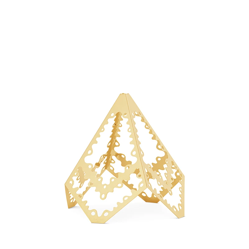 Designeren Sanne Lund Traberg står bag dette års serie af Georg Jensen julepynt. Dette feminine og detaljerige juletræ er fremstillet i rustfrit stål belagt med 18 kt. guld. Det lille juletræ er udsmykket med nærmest blondelignende detaljer, der giver træet den karakteristiske og unikke silhuet.