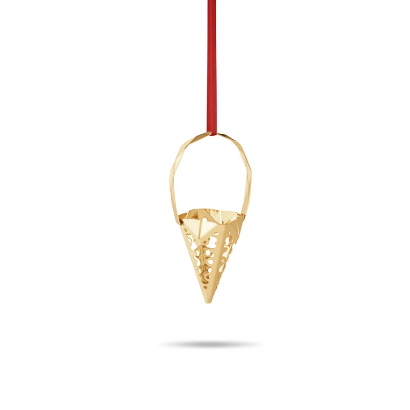 Det smukke juleornament formet som et kræmmerhus fra Georg Jensen 2022 juleserie er belagt med 18 karat guld, og pyntet med de fineste blondeinspirerede mønstre. Der medfølger to bånd til ophængning – den ene er i den klassiske røde farve, og det andet er årets bånd, som er i farven offwhite. Kræmmerhuset er designet af Sanne Lund Traberg, som har designet flere af Georg Jensens tidløse juleornamenter. Lad det elegante ornament hænge og pynte på juletræet eller i vindueskarmen.