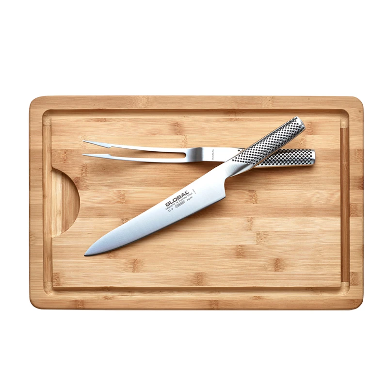 Global forskæresæt bestående af G-3 chefkniv, G-13 buet stegegaffel. Gaflens buede form gør det nemt at skære stegen ud med chefkniven.