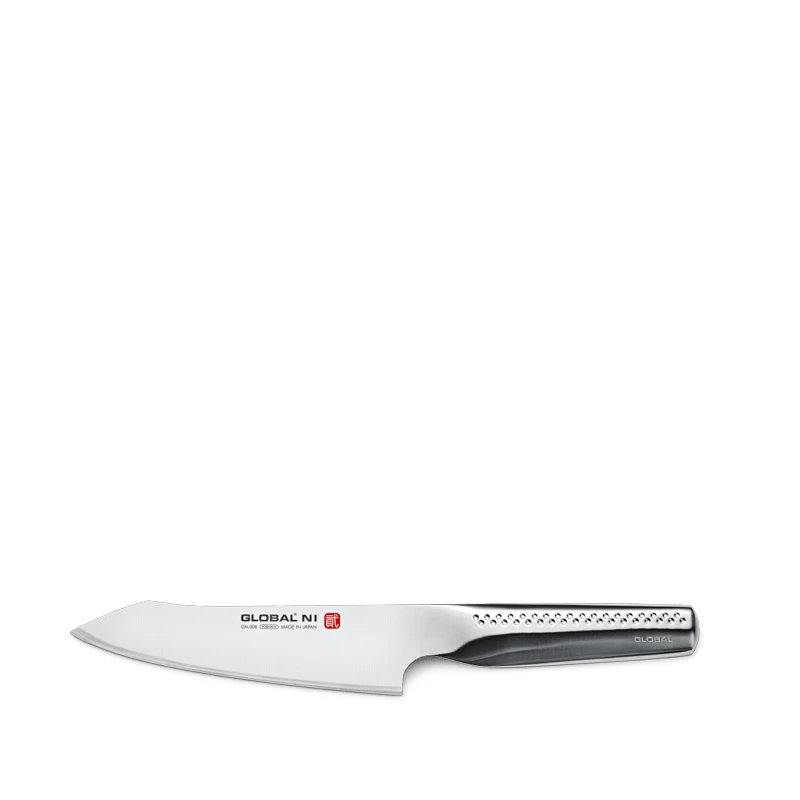 Global NI orientalsk kokkekniv har et 16 cm langt blad der giver dig unik kontrol over kniven. Den buede form gør den særligt god til hakke og snitte opgaver og lader kniven arbejde selv.