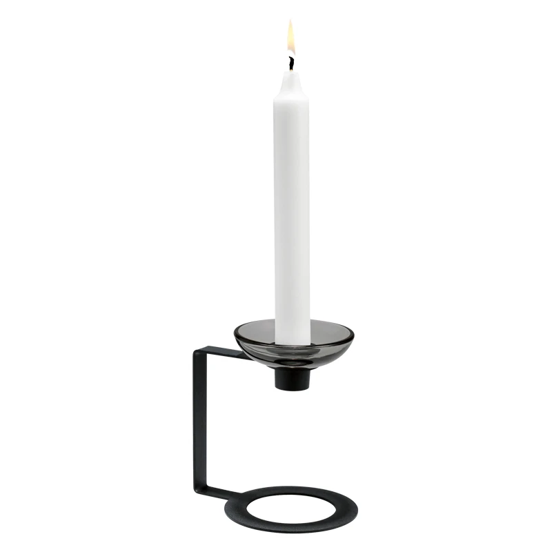 Holmegaard Lumi lysestage 1-armet. Design Maria Berntsen. I metal med sort lakering og glasmanchet kurvet smoke. H12,5 cm