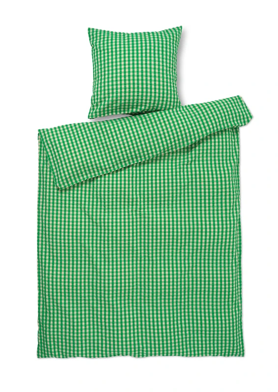 Det sæt tøj du bruger allermest tid i, er dit sengetøj. Derfor er sengetøj fra Juna skabt med intentionen om at være sanseligt, behageligt og 100% økologisk og bæredygtigt, så du trygt kan lægge dig til ro hver aften og få en god nats søvns. Juna handler om glæden ved at omgive sig med tekstiler, der gør livet smukkere, blødere, mere farverigt og sjovere. Derfor er farver og mønstre en stor del af Juna og giver sengetøjet en hyggelig og uhøjtidelig følelse. Den velkendte og klassiske ternede vævning fortolkes i en moderne farvepalet og det er netop kombinationen af det nostalgiske og nyskabende er med til at skabe en unik og glad stemning i indretningen. Den ternet Bæk & Bølge i grøn/sand har en skøn friskhed og sprødhed over sig – nærmest som nyudsprungne bøgeblade. Materialet er 100% økologisk bomuld, der både er OEKO-TEX®-mærket og GOTS-certificeret. Pudebetrækket lukkes med kuvertlukning, mens dynebetrækket lukkes med knaplukning. Har du flere forskellige sengesæt fra Juna, kan du mixe og matche de forskellige farver og mønstre på kryds og tværs og skabe din helt egen stil i soveværelset. Bæk & Bølge er vævet, så det har en helt speciel tekstur, der lader luften cirkulere mellem huden og dynen – perfekt til de varme sommernætter. Det giver en god nats søvn, så du kan restituere og lade op til en ny dag. Og så er det ovenikøbet strygefrit, så du kan lade den lune sommervind om tørringen og lægge sengetøjet på direkte fra tørresnoren. Sengesættet består af 1 dynebetræk på 140×200 cm og 1 pudebetræk på 60×63 cm
