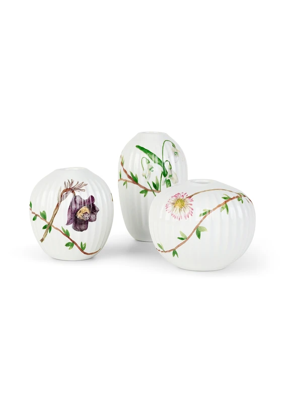 De yndige og hyggelige miniaturevaser fra Kähler Hammershøi er dekoreret med nyudsprungne grene og blomsterne; Kobjælde, Vintergækken og Margueritten – de smukkeste forårsbebudere, der er håndmalet af Rikke Jacobsen og overført til porcelænet.