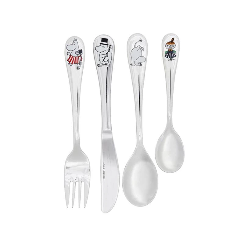 Hyggeligt børnebestik med motiv fra Mumi familen. Sættet består af kniv, gaffel, ske og teske/ dessertske Fremstillet i rustfrit stål