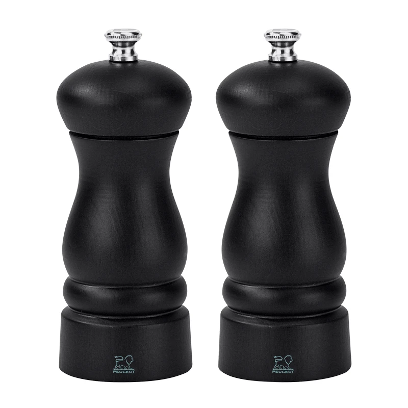 Flot Peugeot salt-og peberkværnsæt i sortmalet træ og knop i metal.