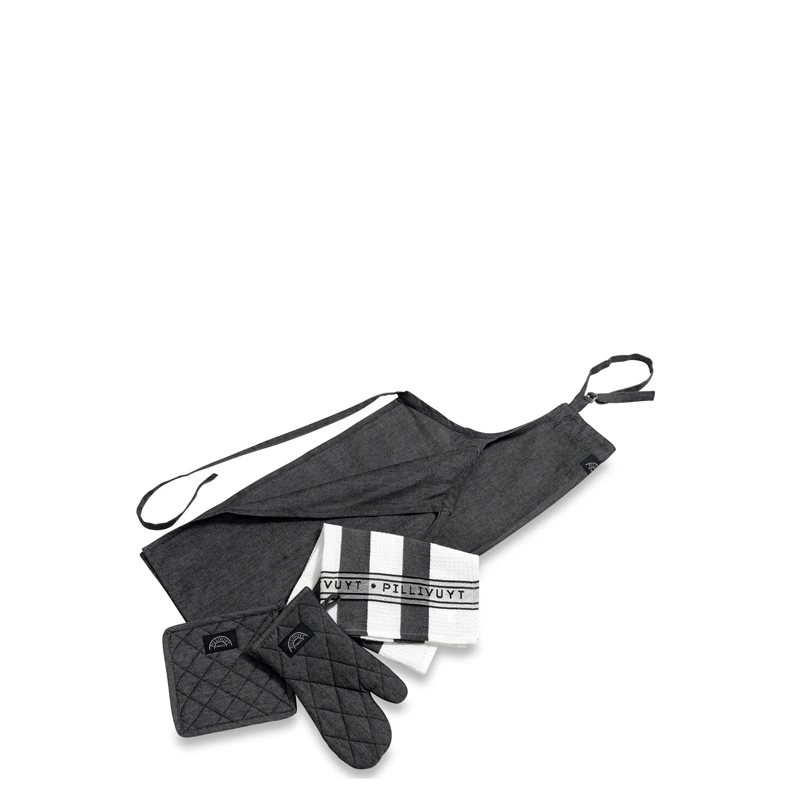 Pillivyut tekstilsæt med 6 dele. 2 viskestykker, 2 grydelapper, grillhandske og forklæde. Grå/hvid strib Fremstillet i 100% ny bomuld